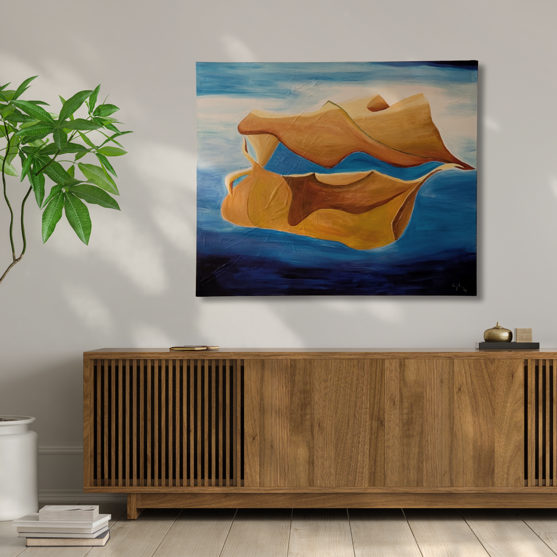 Žena nesoucí vodu, je originální akrylová obraz inspirovaný propojením ženského těla, krajiny a vodního živlu. Plynulé tvary a hluboké modré tóny evokují klid, vnitřní sílu a přirozený tok života.