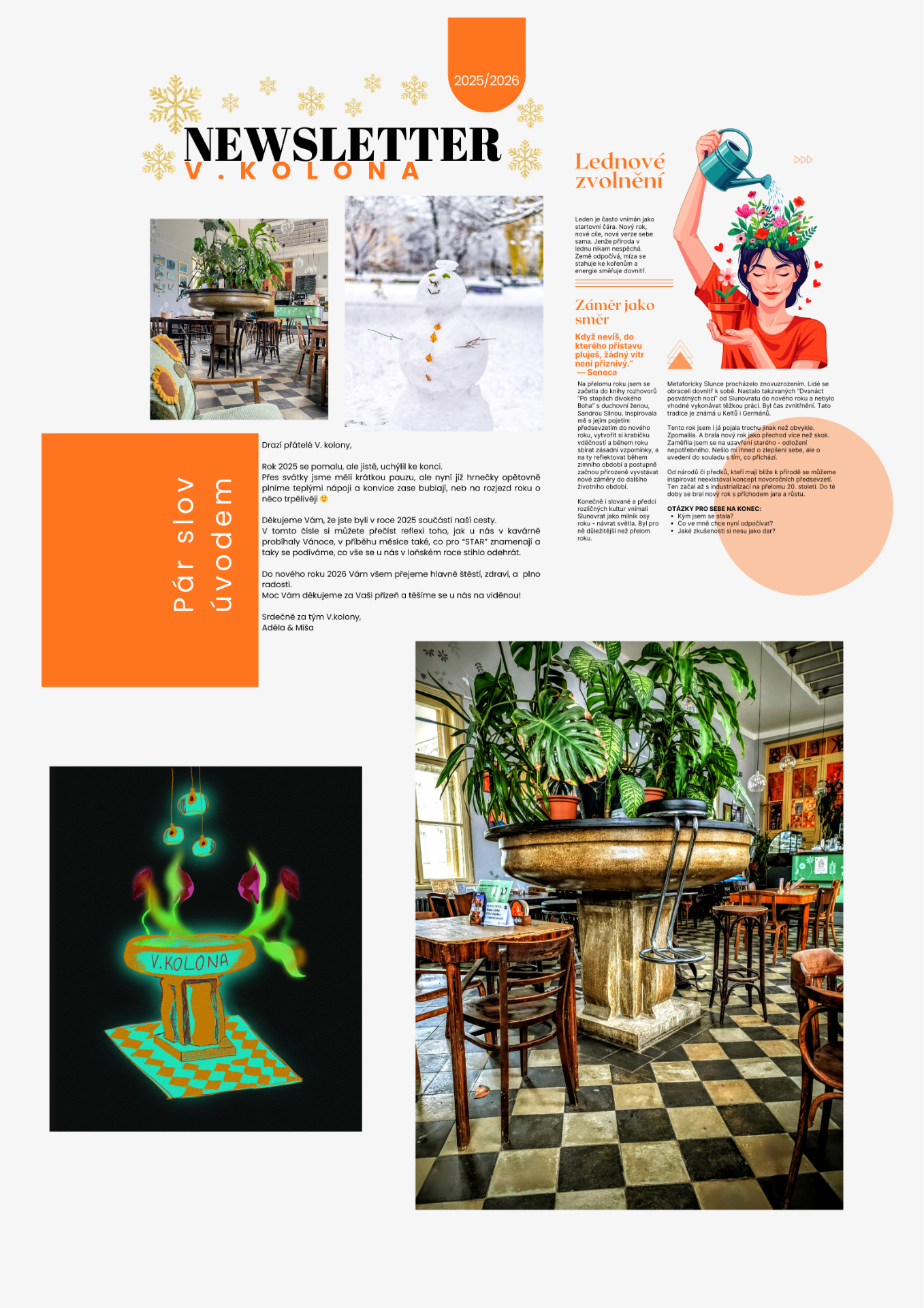 V rámci tréninkové kavárny V. Kolona, jsem absolvovala roční pracovní rehabilitaci v rámci mé cesty zotavení. Z konce rehabilitace jsem se začala zapojovat i do grafické úpravy a obsahové náplně kavárenského newsletteru, který vychází jako měsíčník. Spolupracuji s týmem V. Kolony kontinuálně.